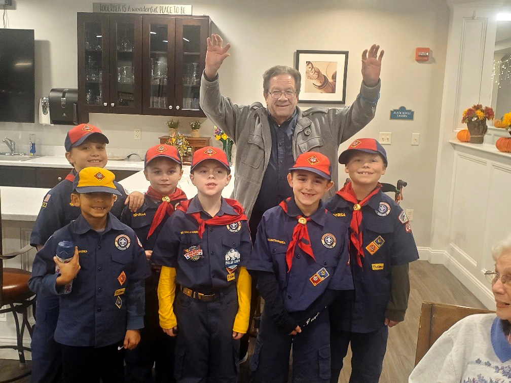 The Local Cub Scout Wolf Den, made up of second graders, visited our residents and shared cards and pictures they made for Thanksgiving.